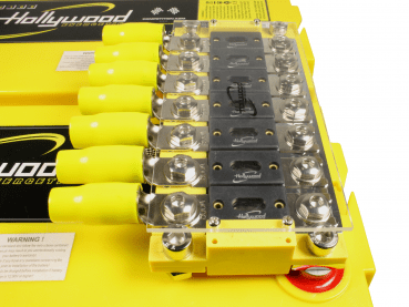 El Hollywood SPV T200 es un tanque de baterías de alto rendimiento formado por dos SPV 100 de 260 Ah en conjunto, diseñado para sistemas de car audio que demandan potencia extrema, hasta 10 kW RMS. Su construcción AGM libre de mantenimiento permite montaje horizontal o vertical, mientras que sus puentes HPM de alta conductividad y la distribución de 7x ANL fusibles y 7x no fusibles garantizan eficiencia máxima con mínima pérdida de espacio. El diseño Plexi Top protege la instalación y facilita la integración de sistemas complejos de alto consumo en espacios limitados.