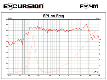 Parámetros T/S: Fs 125 Hz, SD 55,4 cm², Vas 1,01 L, Cms 230 µM/N, Mms 6,03 g, Bl 3,07, Qms 3,87, Qes 1,61, Qts 1,13